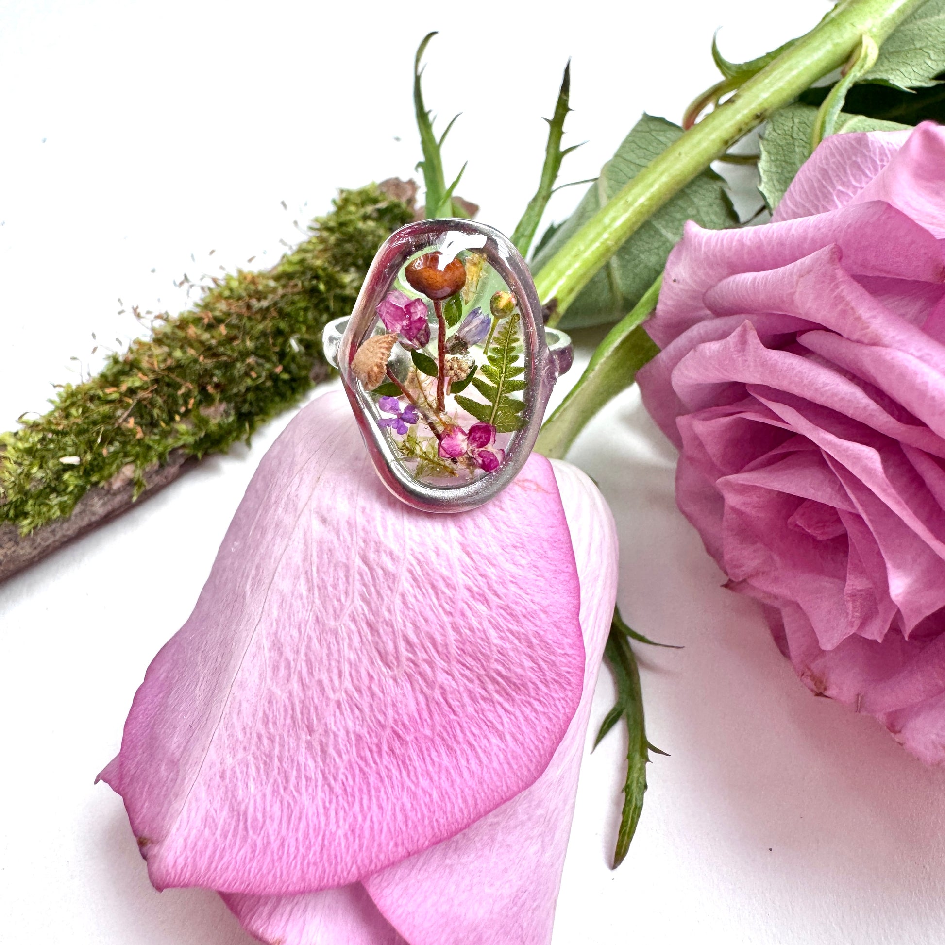 Materials: Real pressed flower, stainless steel frames, UV resin.