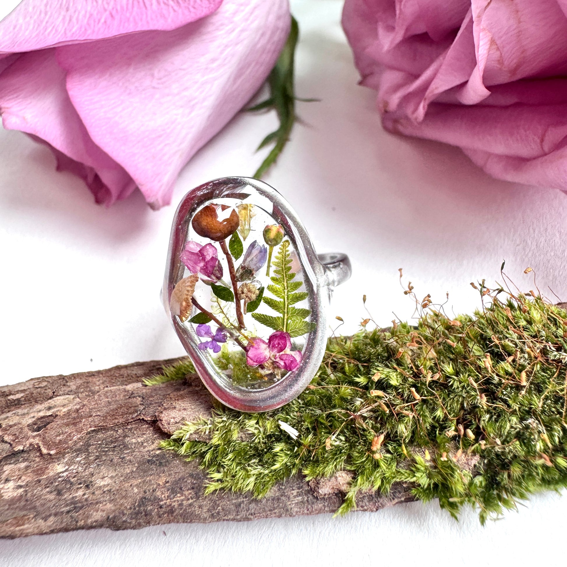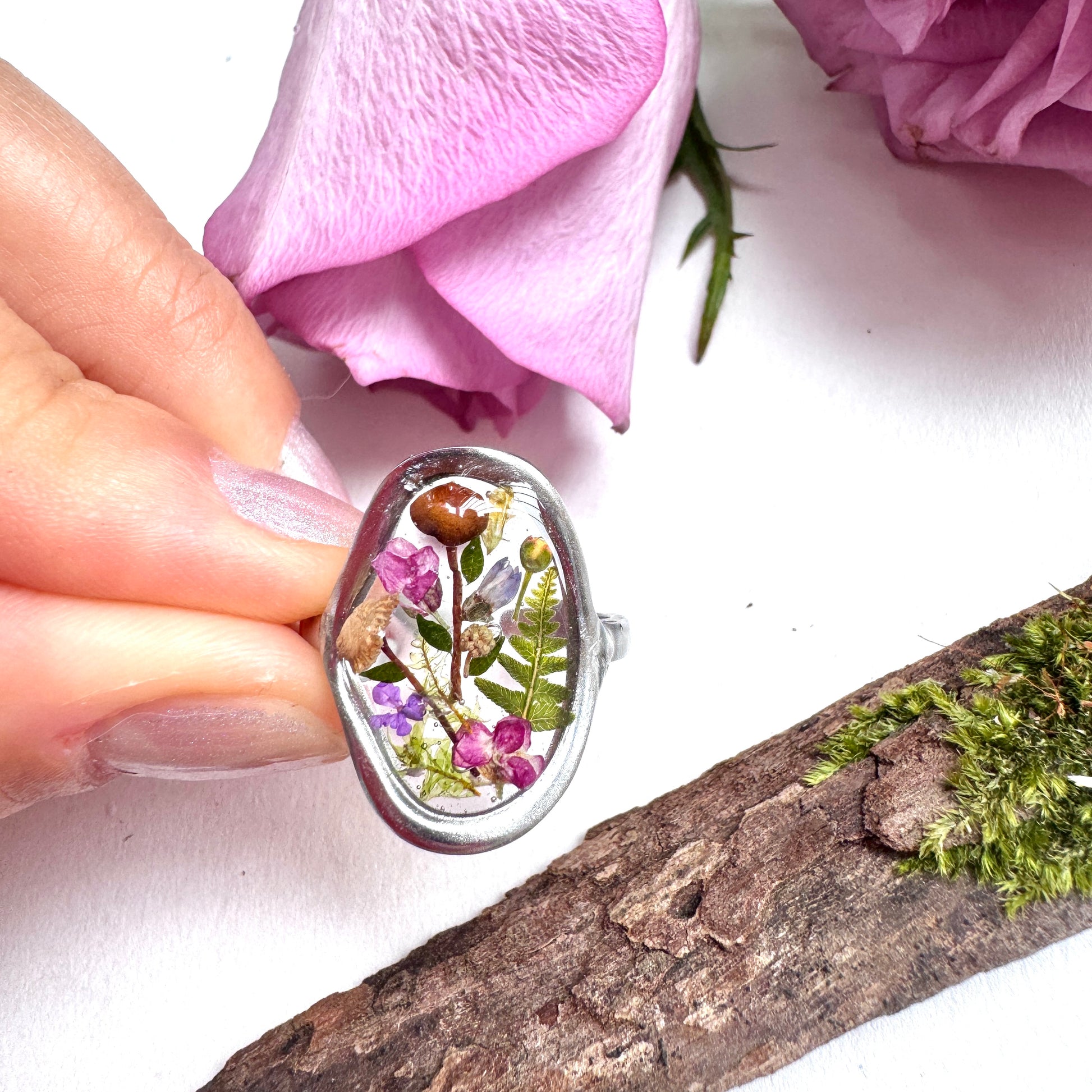 Each item is handmade in a one-of-a-kind design with high-quality UV resin that avoids yellowing. Flowers were pressed for about two weeks to remove moisture, and some have been tinted to preserve color.